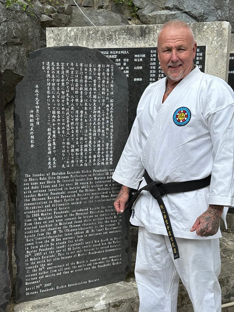 Below is a wonderful photo of Paul Jarrett, Sensei, at the shrine of the Founder of Shotokan, Funakoshi Gichin (also known as Gichin Funakoshi). This shrine is in Okinawa, the literal “birthplace” of karate.